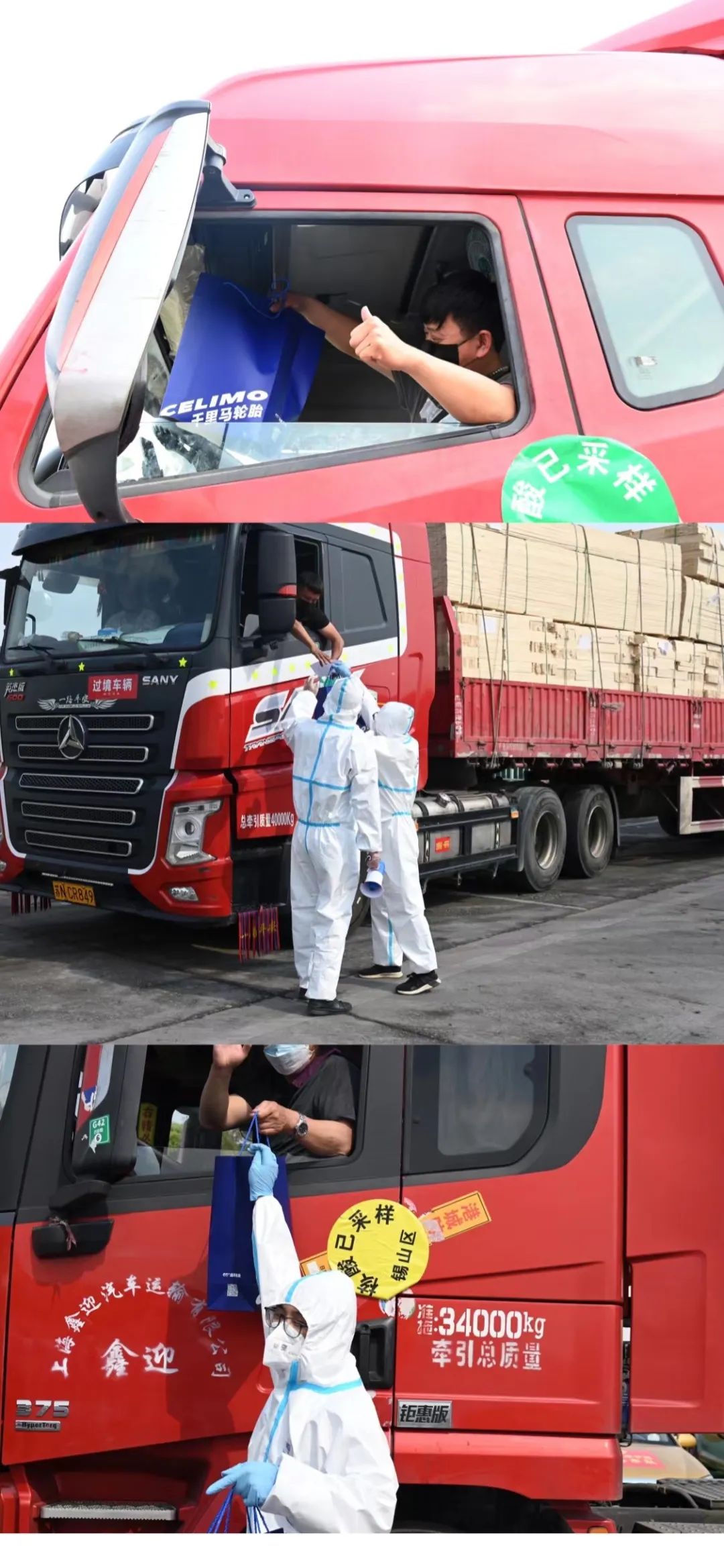 4月12日,通用股份志愿者,前往無錫高速公路羊尖路口和服務區,為貨車司機、愛心車隊司機和一線工作人員送去了愛心禮包,向他們致以敬意和衷心的感謝,同時,為卡車司機師傅們全力保障貨運物流暢通貢獻出一份力氣量!